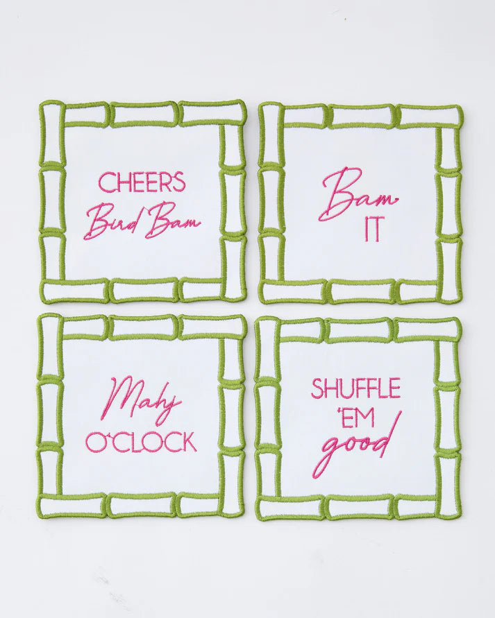 Presenting our Bamboo Mahjong Cocktail Napkins, a collection of four intricately embroidered napkins designed to elevate your Mahjong gatherings. These complement our Bamboo cocktail markers, offering the ideal complement to your Mahjong hosting needs.