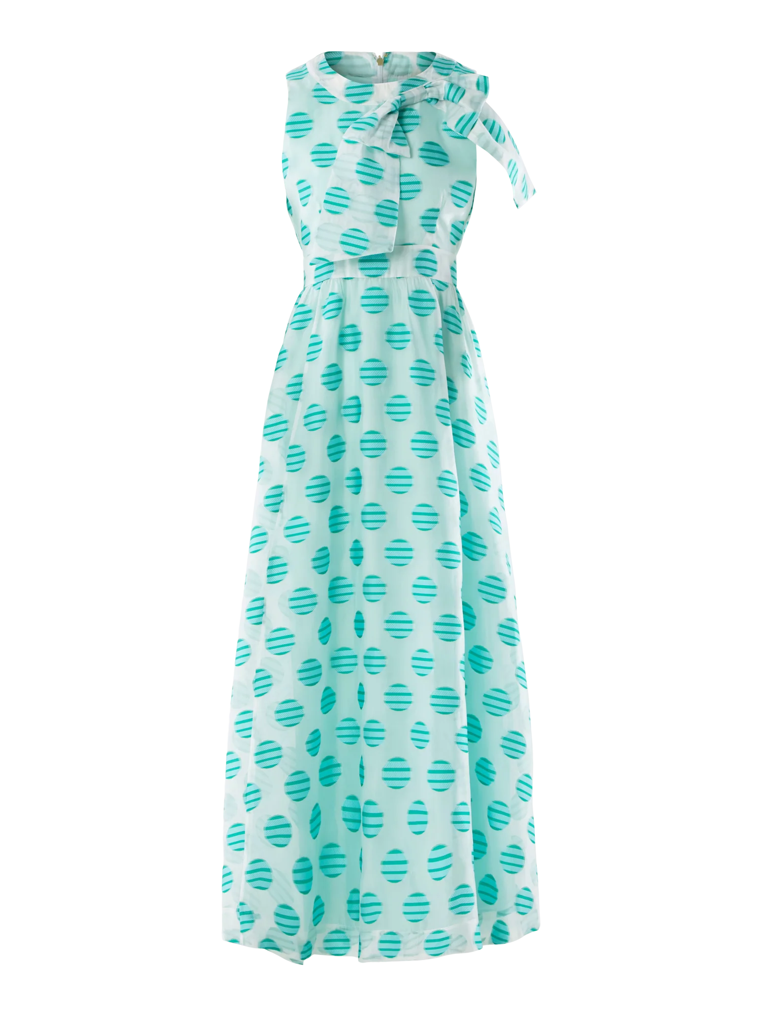 The Bella Maxi in Dew Drop is a refined statement piece crafted in airy organza jacquard. This silhouette features a stitched bow detail at the neckline, an empire waist that flatters the form, and a tailored bodice that gently flows into a full-length skirt. The subtle back zip closure ensures a seamless finish. With its tonal textural pattern and feminine charm, this dress is a fresh take on elegant occasionwear.
