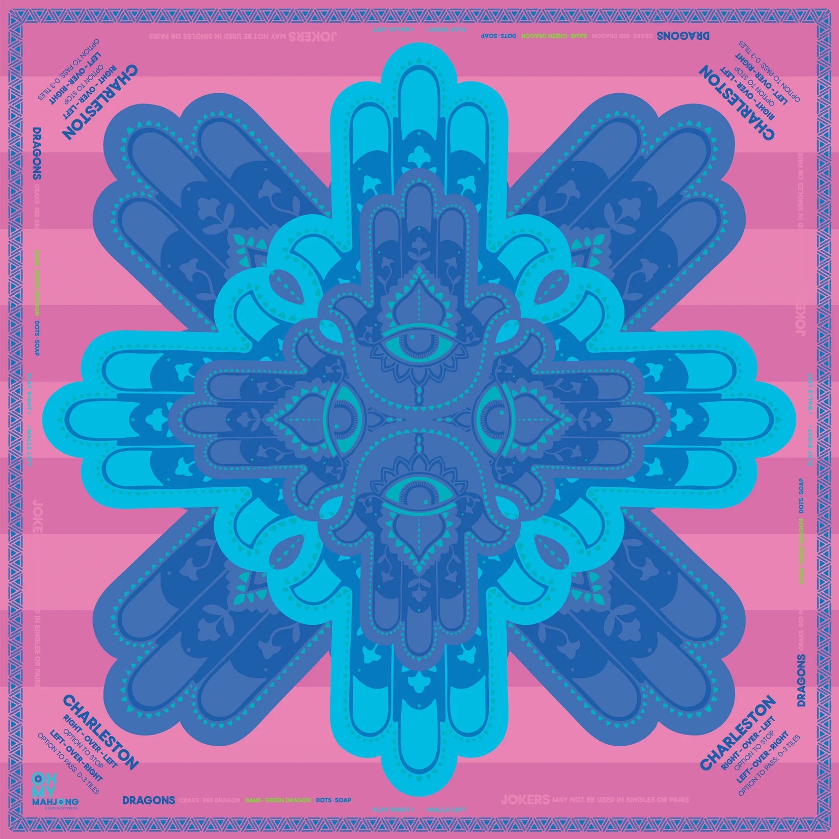 Bring balance and beauty to your mahjong game with the Chakra Mat. Featuring a bright pink and blue palette and an intricate Hamsa hand design symbolizing protection and positivity, this mat is as meaningful as it is stylish. Like all our mats, it includes our signature instructional reminders along the edges to guide your gameplay. It comes rolled in a durable canvas drawstring bag for easy storage and travel. The Chakra Mat is the perfect centerpiece for mindful and connected play.