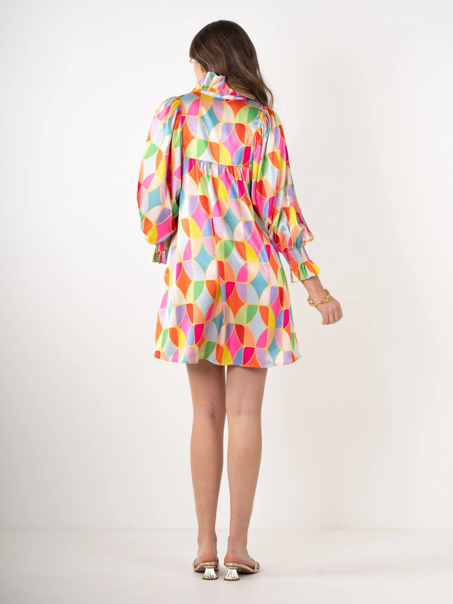 Feminine flair meets artful design with the Charlotte Dress in Sunday Morning. Featuring a ruffle stand collar, blouson smocked sleeves, and delicate pintucks bordering the signature gold button closures. Its forgiving silhouette offers ease of movement and all day comfortability for almost any occasion. The rich 'Sunday Morning' print uses bold color to create a captivating pattern inspired by stained glass windows, infusing your wardrobe with a touch of optimism and artistic flair.