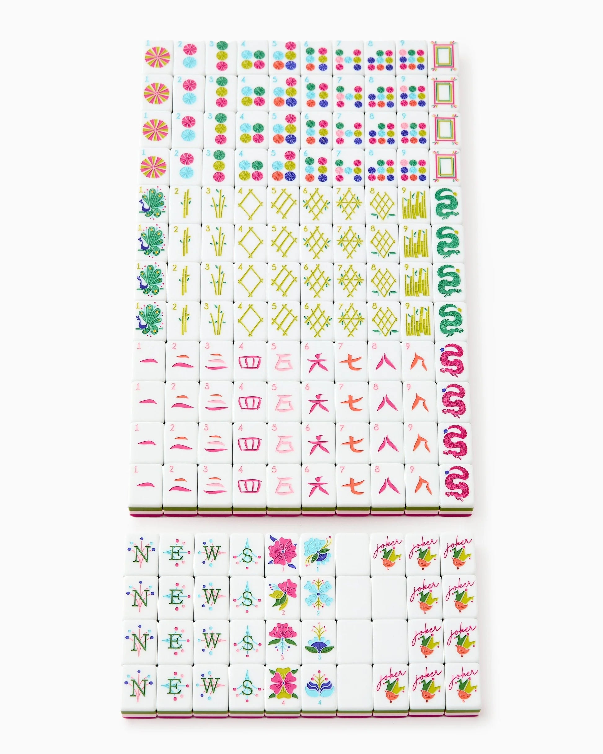 Set includes Tiles, Dice/Coin Bag and 4 Instructional Cards (If playing American Mahjong, will need to purchase NMJL Playing Card separately).