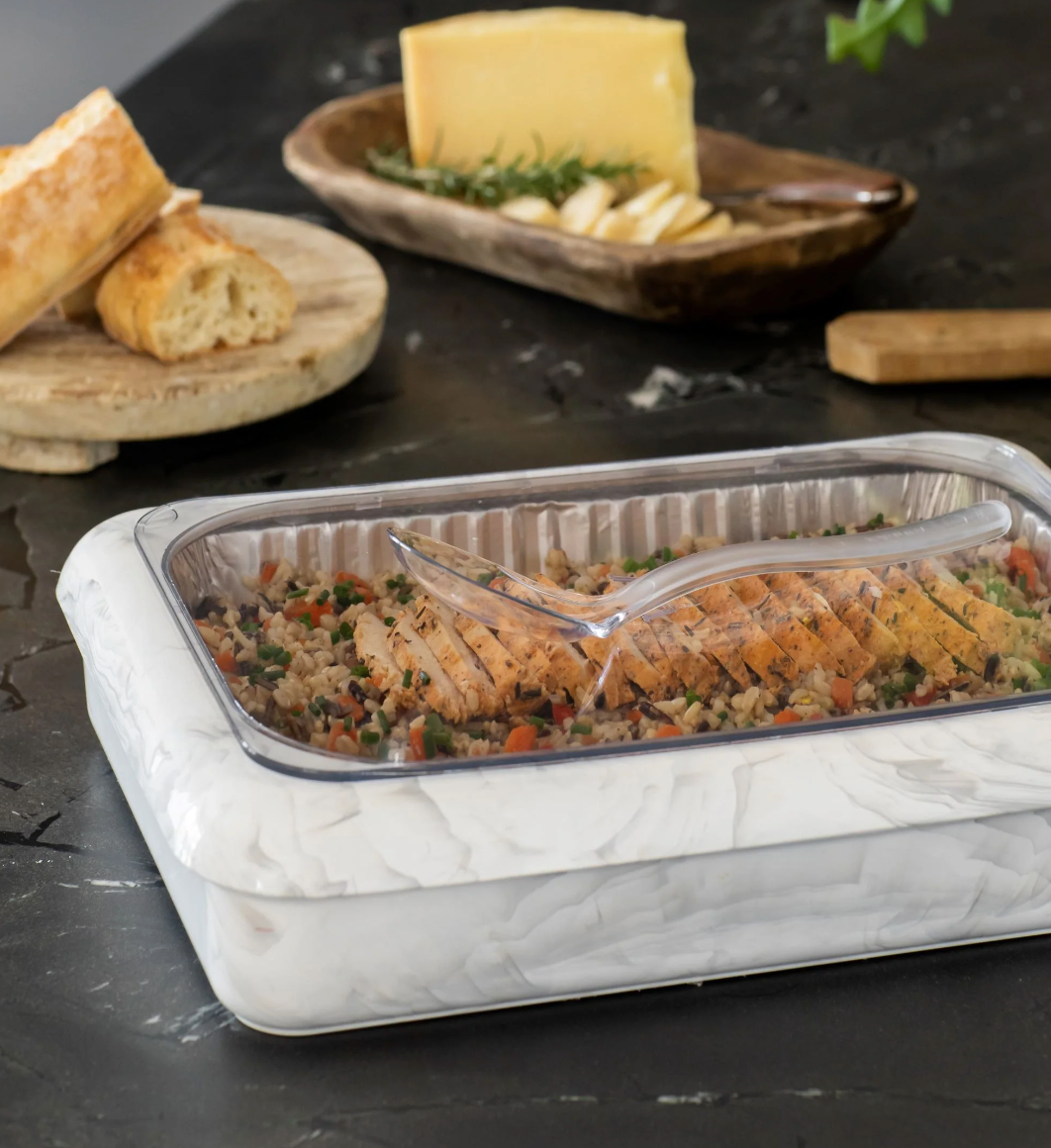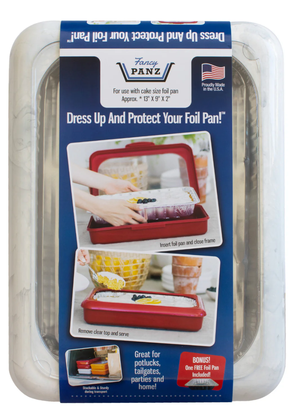 Take hot or cold food to your next event in a foil pan placed in a decorative Fancy Panz, 9x13, cake size!When it's time to serve, just remove the clear top and place it under your Fancy Panz'™ where it nests perfectly!
