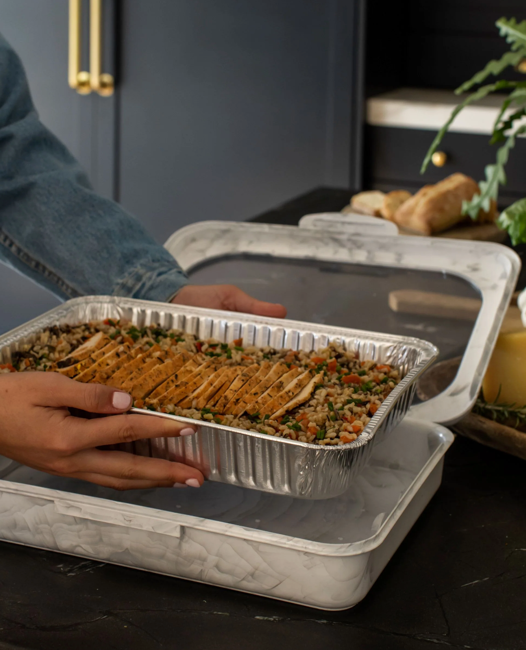 Enjoy the convenience of cooking in a foil pan and impress your guests by serving in a Fancy Panz®. No more grimy pans to scrub or dirty serving dish to bring home- just remove the foil pan and and wipe down your Fancy Panz!