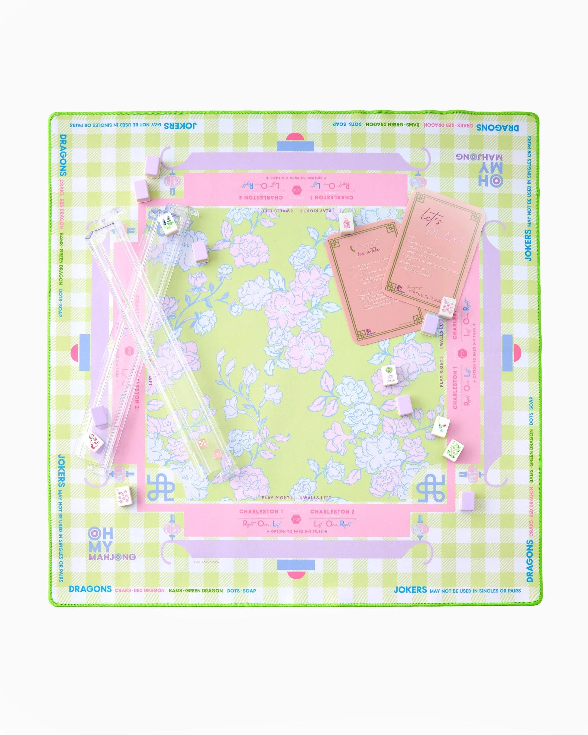 Introducing the Garden Party Mahjong Mat—a delightful combination of vibrant pastel hues and enchanting florals, intertwined with a charming green gingham pattern. This neoprene mat features a non-slip bottom to ensure your tiles stay perfectly in place, game after game. Adorned with delicate blossoms and inviting colors, it exudes a frilly femininity that is both elegant and playful. Along the sides of the mat, you’ll find the signature Oh My Mahjong instructional reminders, guiding you through each round.