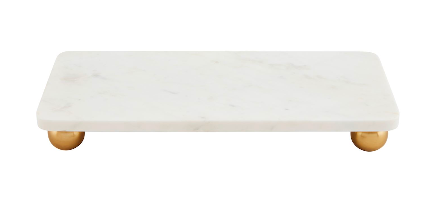 The Gold Footed Marble Board is a stunning addition to any home decor. Crafted from high-quality marble, this board exudes elegance and sophistication. The sleek design is further enhanced by the addition of electroplate metal ball feet, which not only provide stability but also add a touch of glamour to the overall aesthetic. Measuring 6" x 15", this marble board is the perfect size for serving a variety of appetizers, cheeses, or desserts. Its smooth surface provides a luxurious backdrop for showcasing your culinary creations, making it ideal for dinner parties or special occasions. Not only is this marble board visually appealing, but it is also highly functional. The natural properties of marble make it an excellent choice for serving food, as it is resistant to heat and moisture. This ensures that your dishes stay fresh and at the perfect temperature for longer periods. In addition to its practicality, the Gold Footed Marble Board is also easy to clean and maintain. Simply wipe it down with a damp cloth after each use, and it will continue to look as good as new for years to come. Whether you're hosting a formal gathering or simply want to elevate your everyday dining experience, the Gold Footed Marble Board is a must-have accessory. Its timeless design and superior craftsmanship make it a versatile piece that can be used in a variety of settings. Add a touch of luxury to your home with this exquisite marble board.