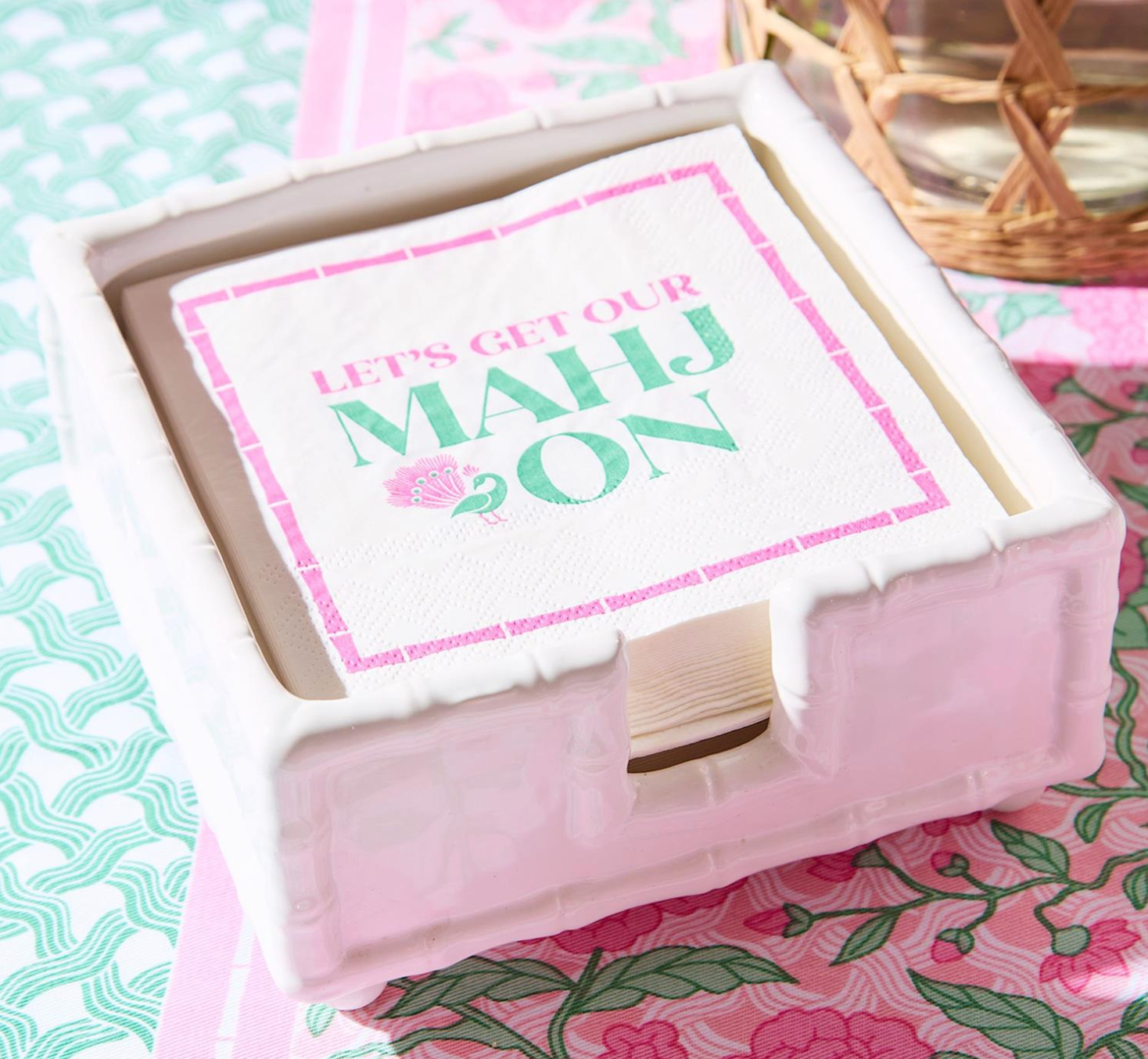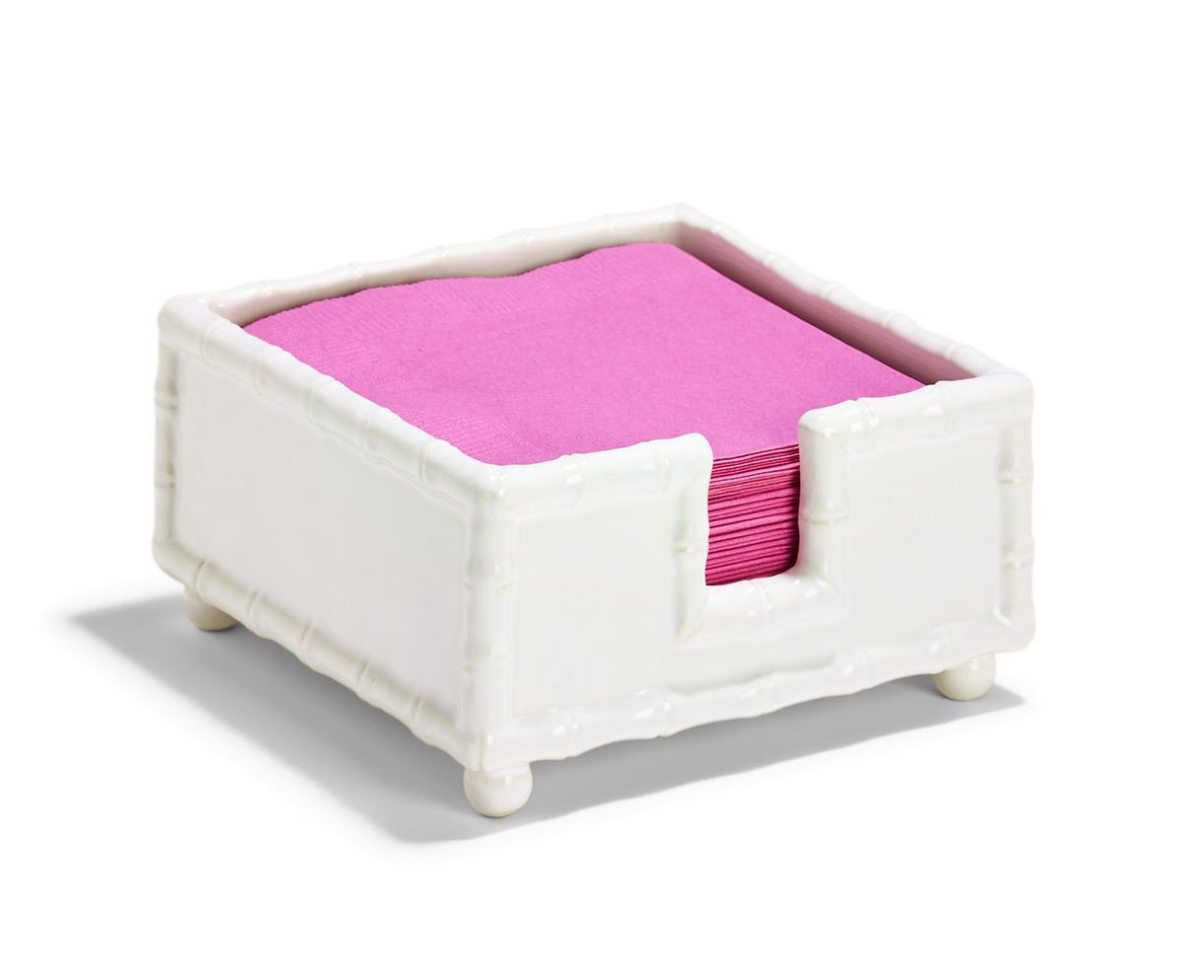 Keep napkins neat and orderly with this glazed ceramic Cocktail Napkin Holder. The Ceramic has been molded into the shape of Bamboo around the edges and features 4 round feet so it stands raised above your countertop.