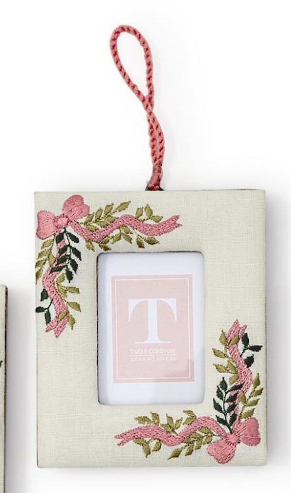 These charming hanging frames feature delicate embroidered details that add a festive and decorative touch to any space. Designed to showcase a small photo or keepsake, each frame is finished with a coordinating ribbon for easy hanging, making them a lovely addition to a tree, wreath, or wall display.
