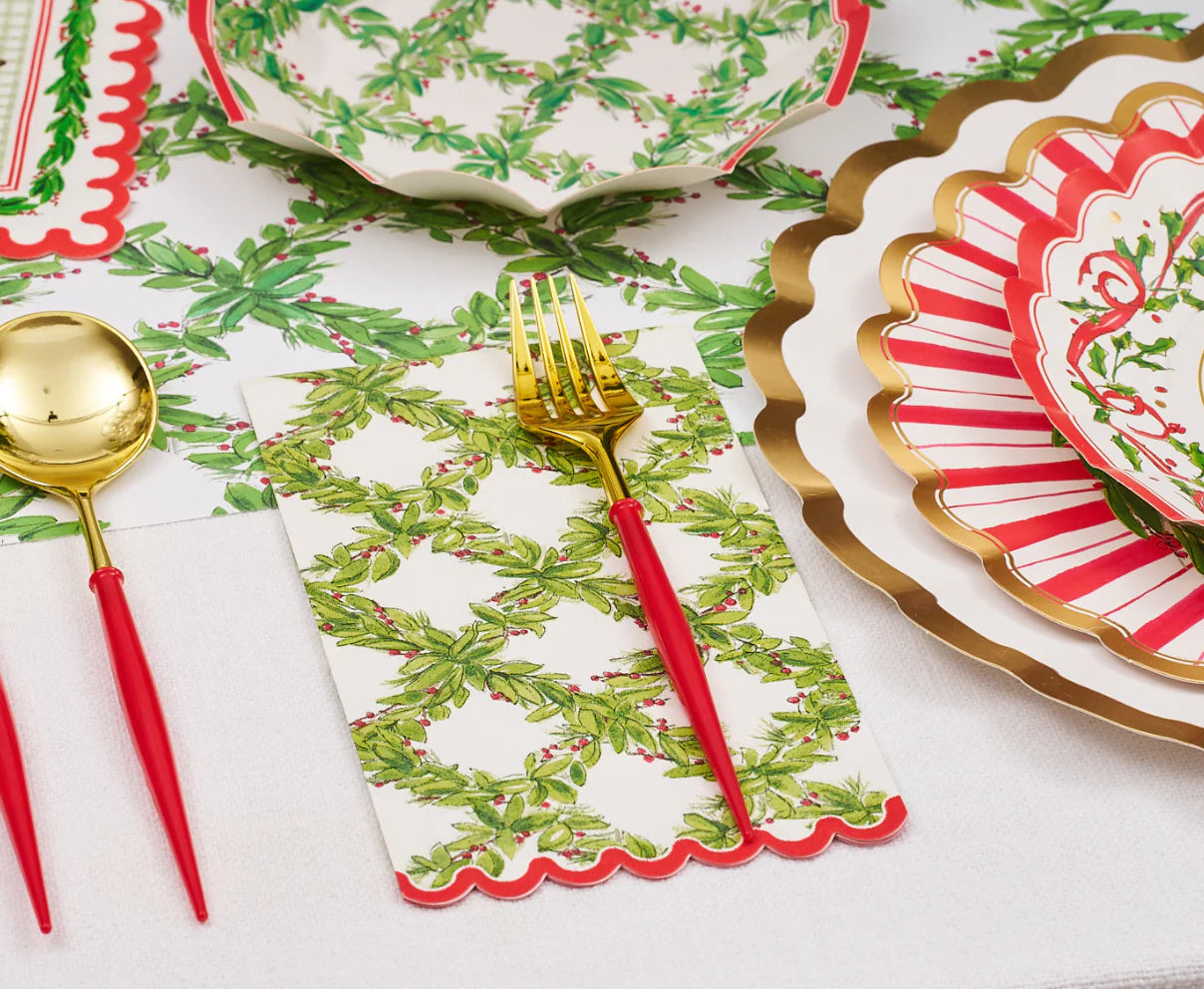 These guest towel napkins from our Holly Berry collection feature a festive trellis of lush Christmas greenery and bright holly berries. Finished with an adorable scalloped red edge, they add the perfect touch of charm to your holiday celebrations. Whether used as a stylish dinner napkin or as an elegant guest towel for your bathroom or powder room, they'll bring a touch of beauty to any occasion!