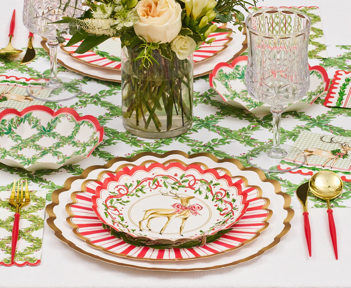 These wavy-edge salad plates from our Holly Berry collection feature a charming reindeer illustration. Enhanced with a holly berry and ribbon design, these plates add the perfect festive touch to your holiday party. These plates are both durable and disposable, allowing you to skip the dirty dishes, without sacrificing quality and style. Your guests will never believe they’re disposable!