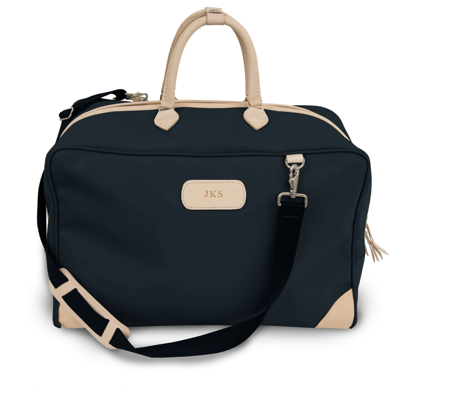 Fly in style with our SS Carry On. This bag's unique shape allows you to fit what you need and easily carry it on your next flight. Features rolled leather handles, reinforced leather corners, and silver feet.