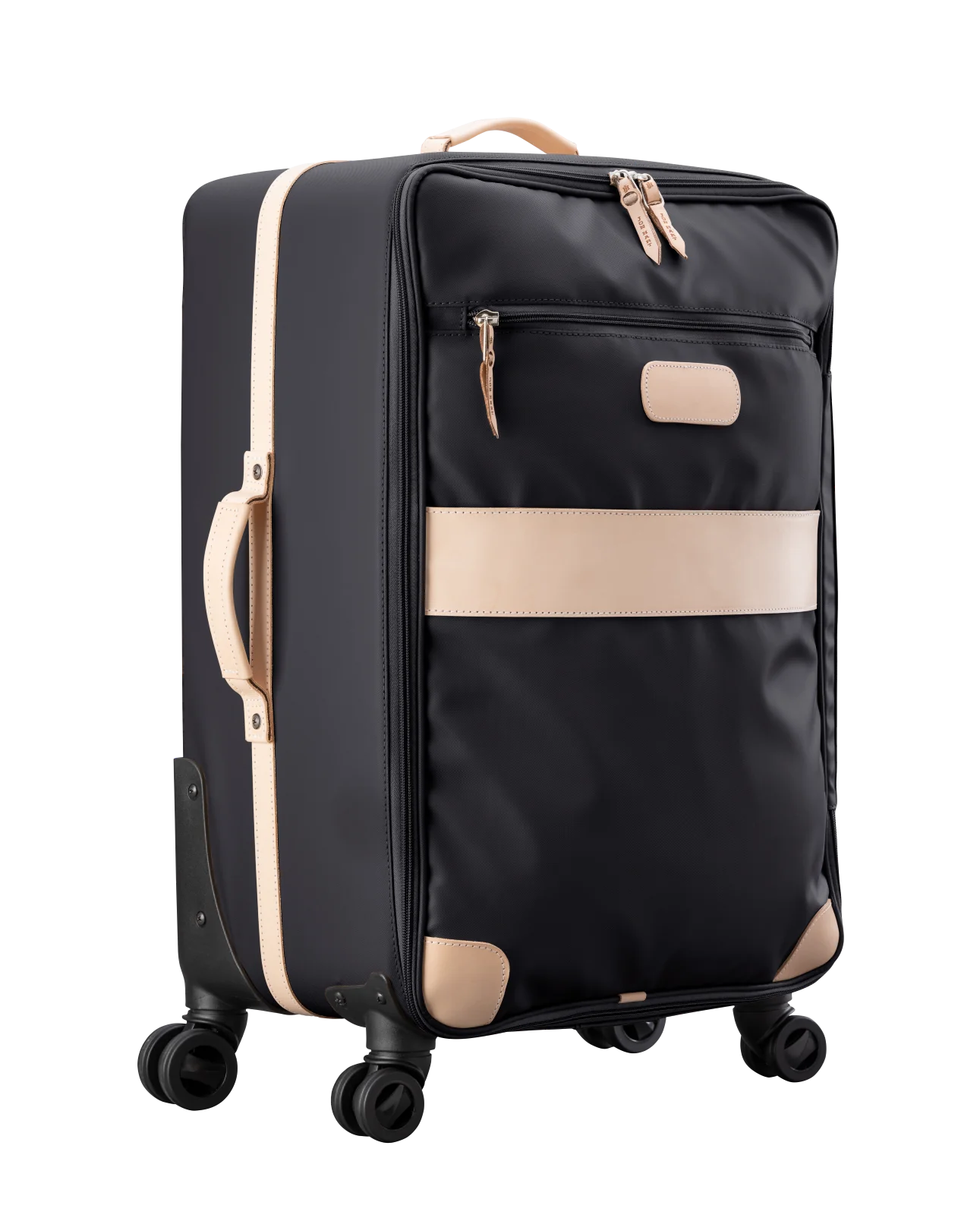 You are going places with this large 360 degree rolling luggage. The included clear cover and removable garment sleeve adds longevity and function to the most beautiful American made luggage around. Available in coated canvas with generous amounts of natural leather trim. The front has a zipper pocket as well as a lined sleeve to hold folders, documents and other items that you need to slip in and get out easily. Natural Leather handles on top and side so that you can lift it from the top or side. Retractable comfort grip handle system. The honeycomb internal frame is light weight, strong and durable. 360 degree wheels for easy rolling. Includes a Natural Luggage Tag and Handle Wrap, removable Garment Sleeve, and Clear Cover with purchase.