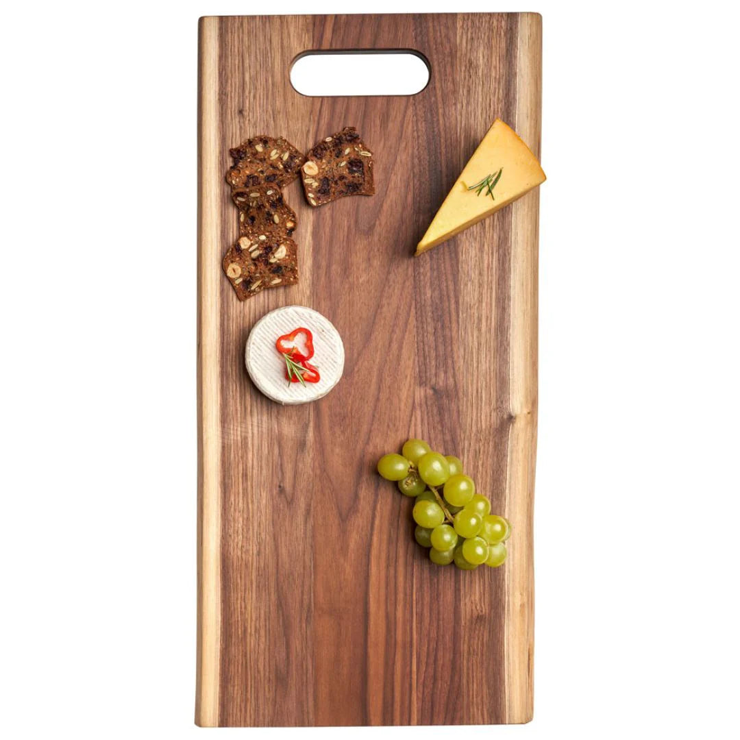 Crafted of premium walnut wood, this gorgeous charcuterie + cutting board features a live edge and is a workhorse that can be used for preparing food or as an impressive serving board or tray for cheese & charcuterie. This naturally self-healing and mark-resistant board is hand finished with durable cutting board mineral oil to both protect the wood and bring out its natural grain. Will last a lifetime