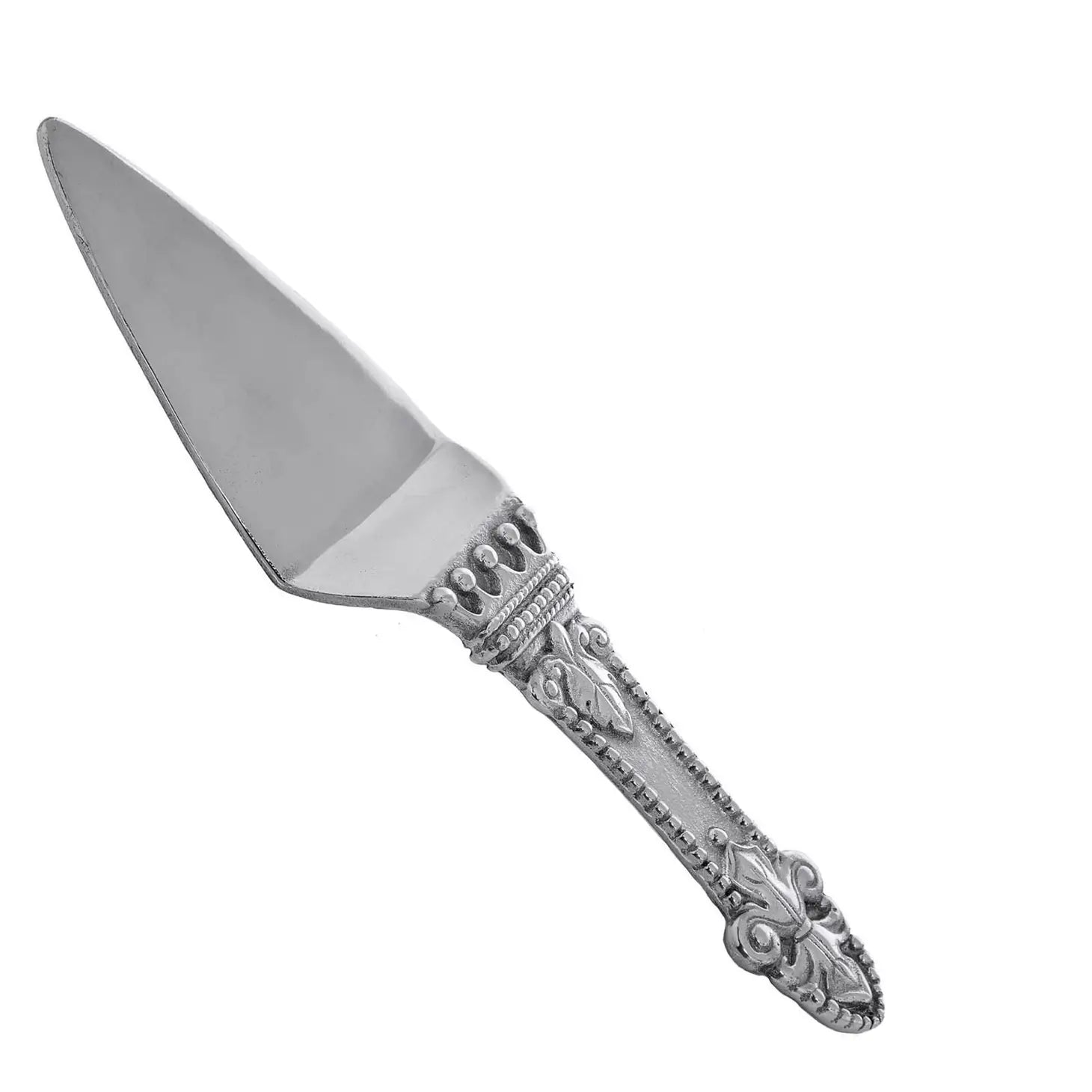 Scoop up the biggest piece of dessert with this elegant Mardi Gras Pie Server from Arthur Court. Fleur-de-lis symbols rest on opposite ends of the piece's beaded handle, while a five-pointed crown adorns the neck. The raised texture of these designs contrasts nicely with the handmade, aluminum server's smooth head. Size: L: 11.5" / W: 3.0" Care: Wash by hand with mild dish soap and dry immediately - do not put in dishwasher.