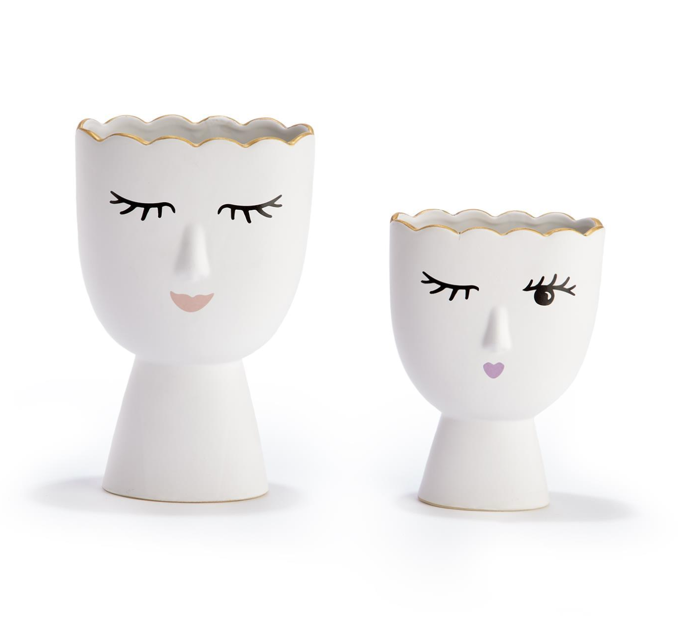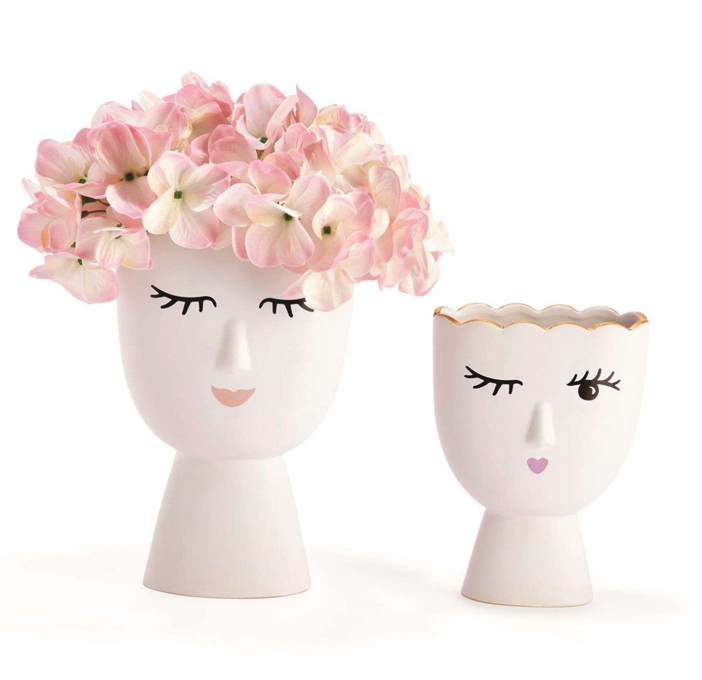 Bring some life to your vanity or dresser with these two Coquette Porcelain Vases. She's got charm to spare, thanks to an enigmatic smile and knowing wink. Gold painted trim along the top edge adds an extra grace note, and her slim profile means she can tuck pretty much anywhere to hold flowers, pens, makeup brushes, anything you like.