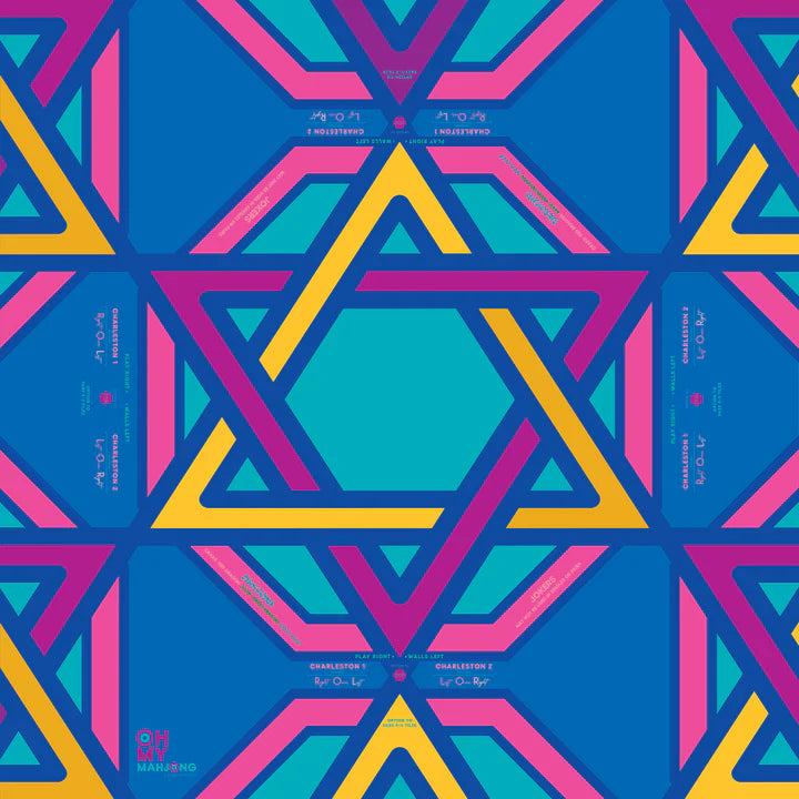 Brighten your game with the Mazel Mat, featuring bold geometric patterns and the Star of David in vibrant yellow, pink, purple, and blue hues. Perfect for players who love a splash of color and good fortune, this mat includes our signature instructional reminders along the edges to enhance your gameplay. It comes rolled in a sturdy canvas drawstring bag, making it as practical as it is beautiful. The Mazel Mat adds a lively, celebratory touch to any mahjong gathering.
