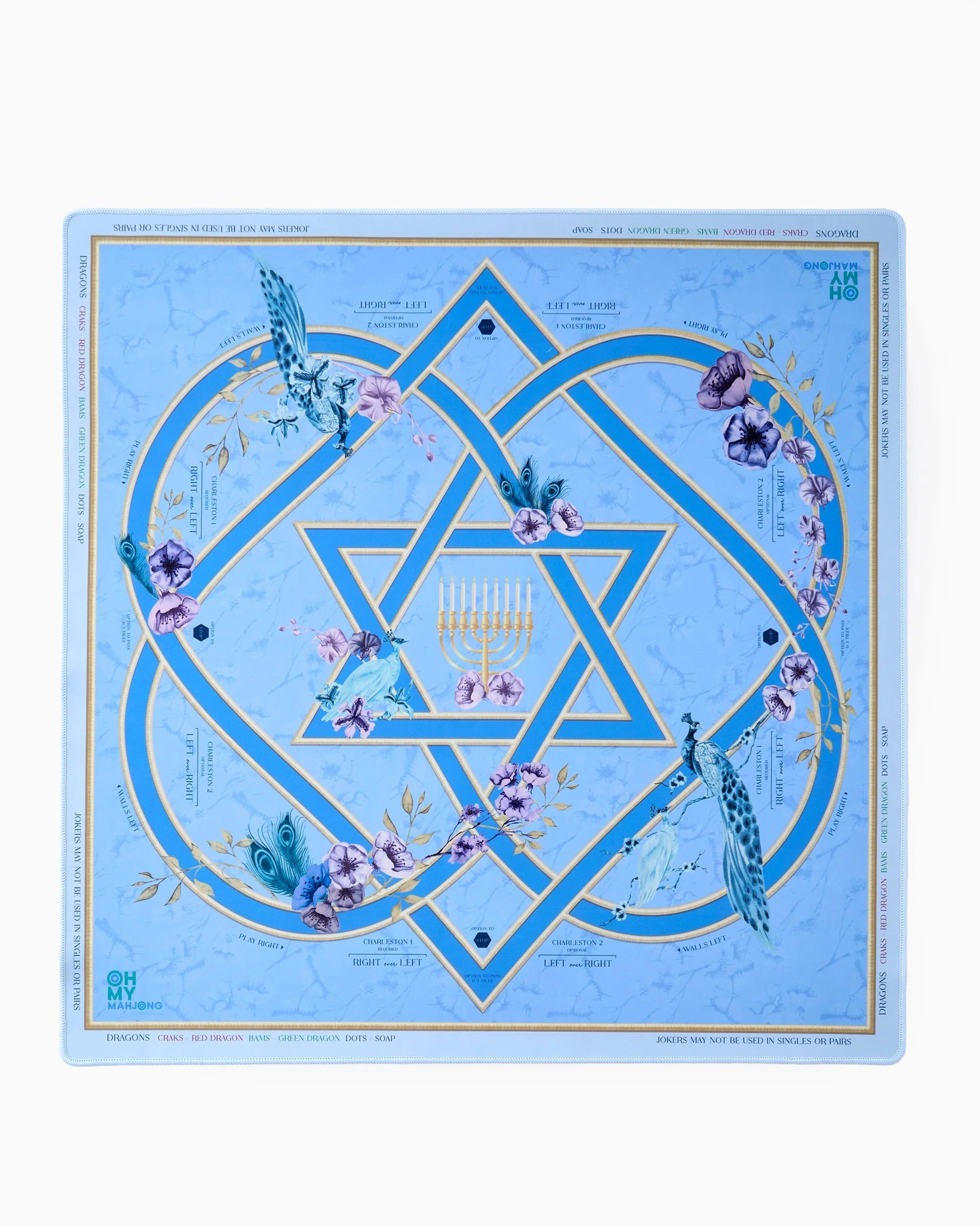 Introducing the Miracle Mat, a mahjong mat crafted for the Hanukkah season. Featuring a beautifully subtle design in blue, purple, and gold hues, this mat captures the festive spirit with elegance. A delicate menorah shines at its center, surrounded by a gorgeous floral scape, creating the perfect blend of tradition and modern play. Whether gathering with loved ones or enjoying a quiet game, the Miracle Mat brings a sense of celebration to every move.