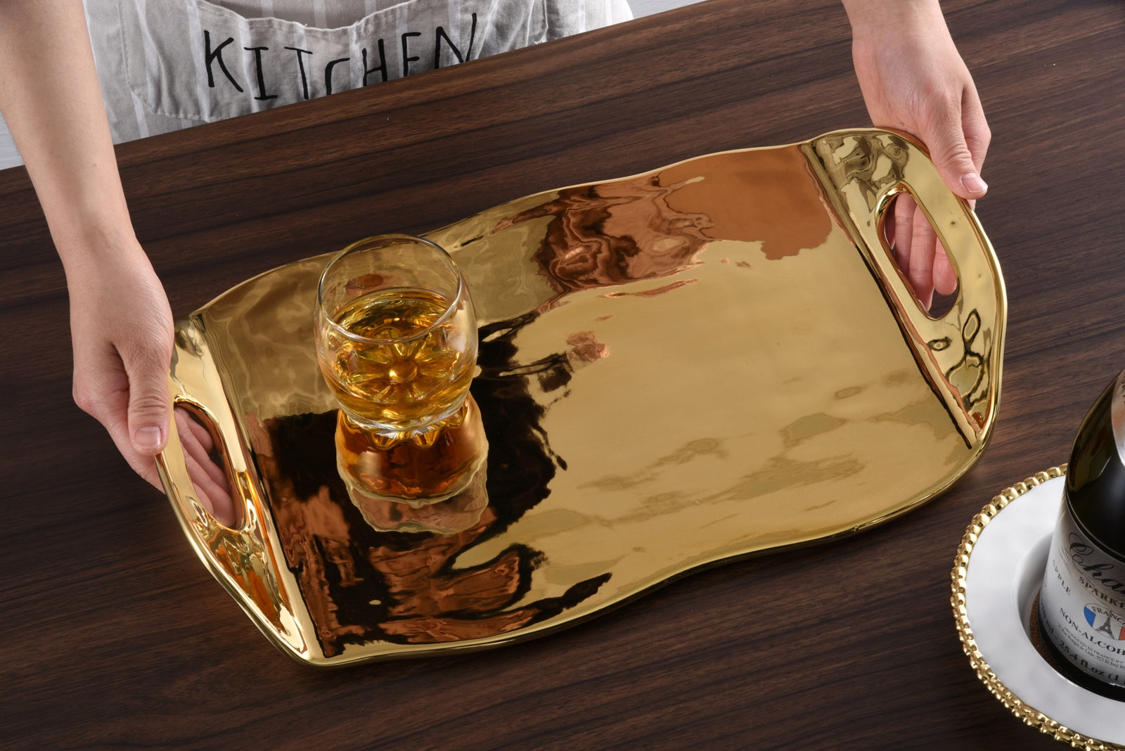 Pampa Bay Tray with Handles from our Moonlight Collection. Whether it is a charcuterie board for two or desserts for a few, this tray is the ideal size for all casual parties. Slide this tray in the refrigerator to chill and keep all your servings fresh and tasty. Striking and elegant gold-tone titanium finished high-fired porcelain.? Food safe, dishwasher safe, oven safe to 500°. Easy Care.