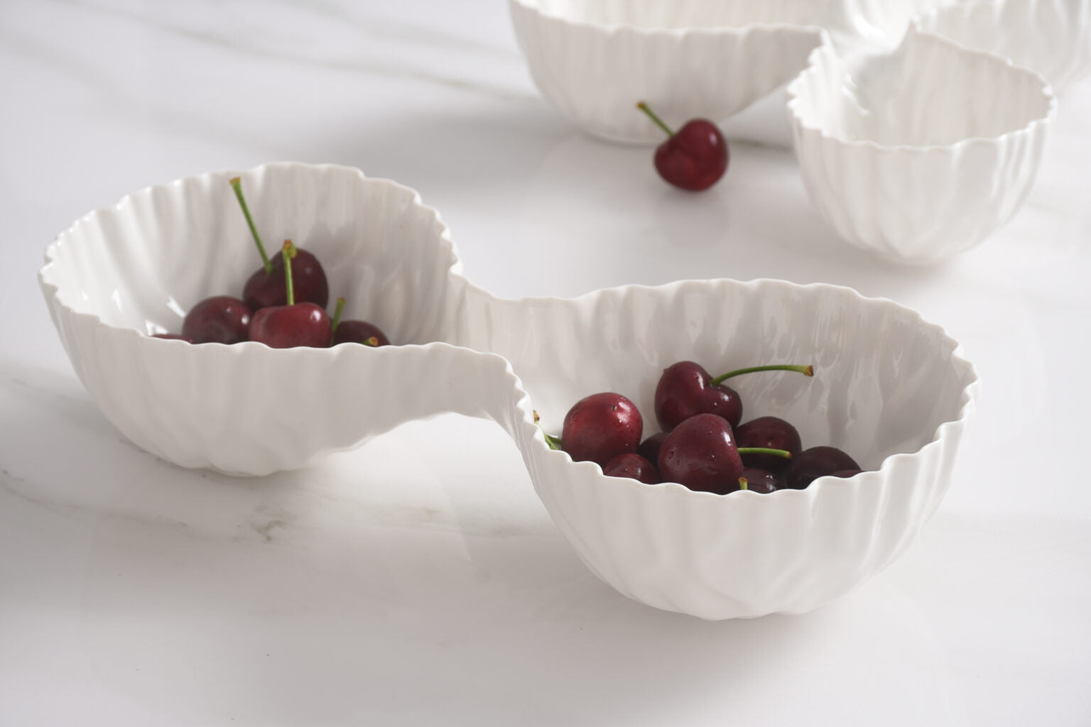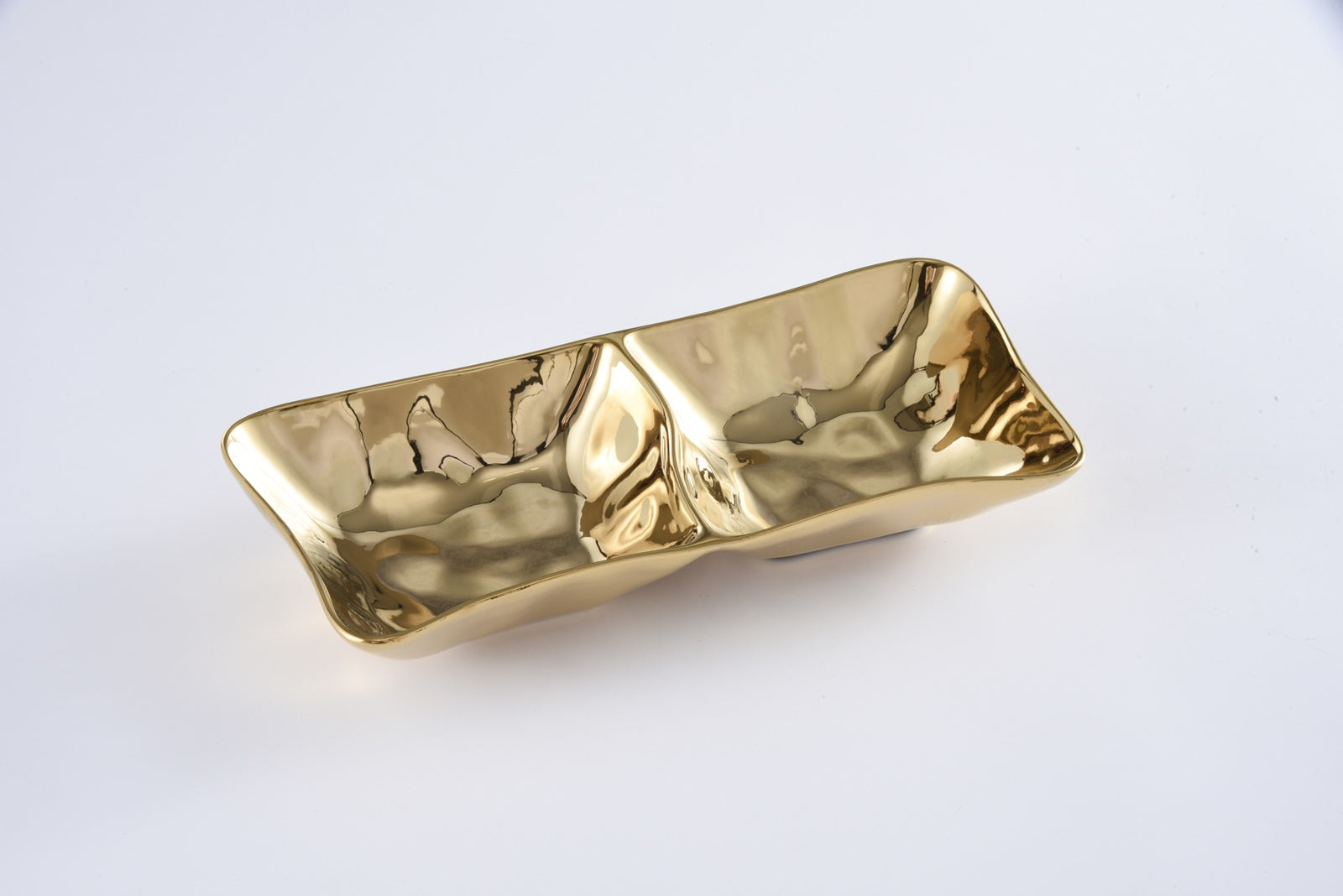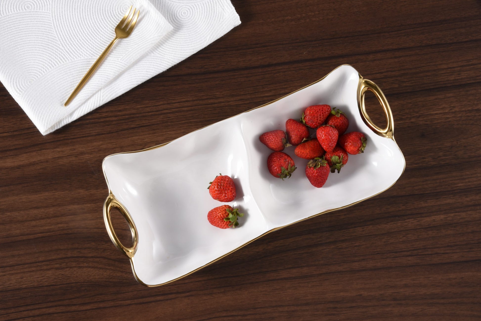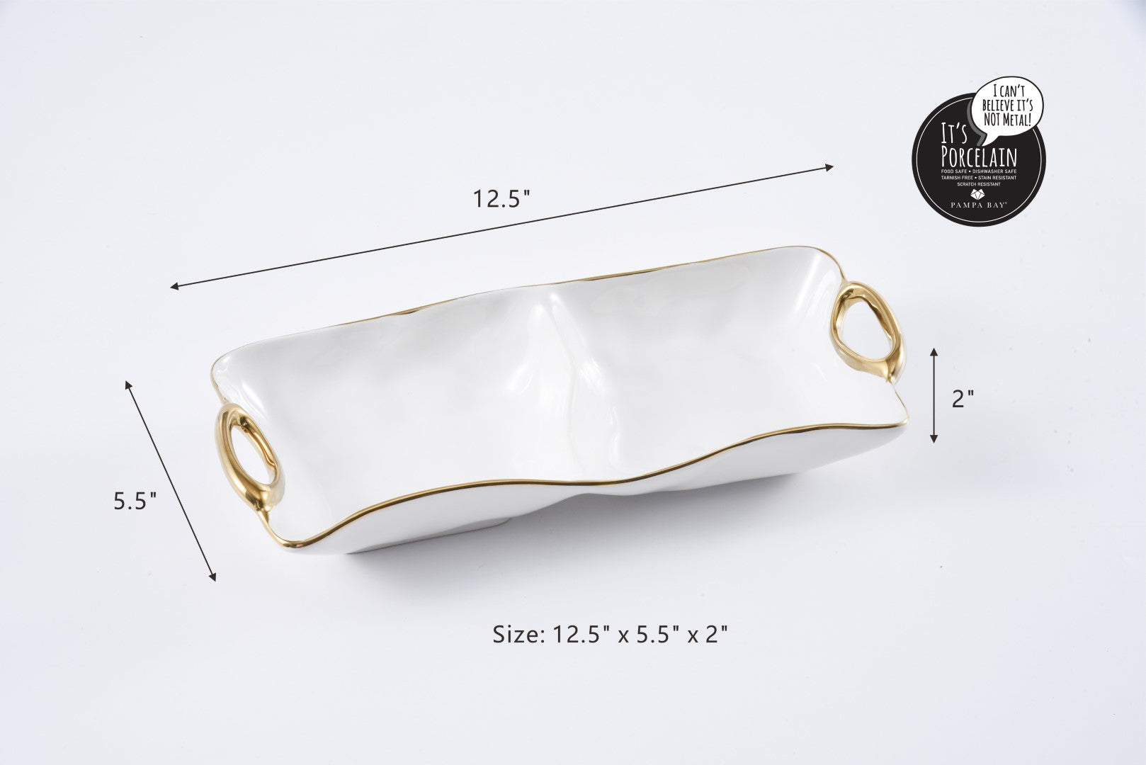 Pampa Bay 2 Section Server in Golden Handles. Great for serving your favorite pairs! Think chips and dip, hummus and veggies or apples and peanut butter. Stunning white porcelain with smooth and fluent handles in gold titanium. Food safe, dishwasher safe, oven safe to 500°. Easy Care.