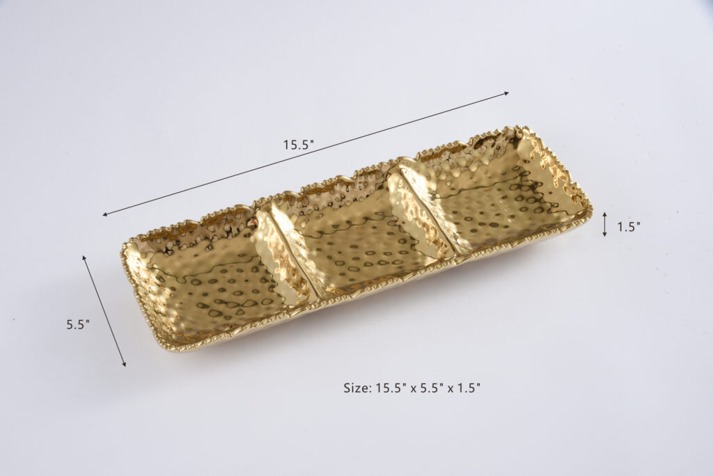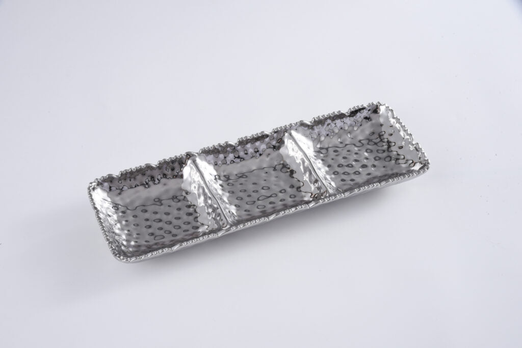 Pampa Bay 3 Section Serving Tray. Get creative! This piece is great for serving different combinations of munchies, dips, and vegetables or all your Tex-Mex needs like guacamole, sour cream and pico de gallo. Striking and elegant silver titanium finished high-fired porcelain. Food safe. Dishwasher safe. Oven safe to 500°. Easy Care.