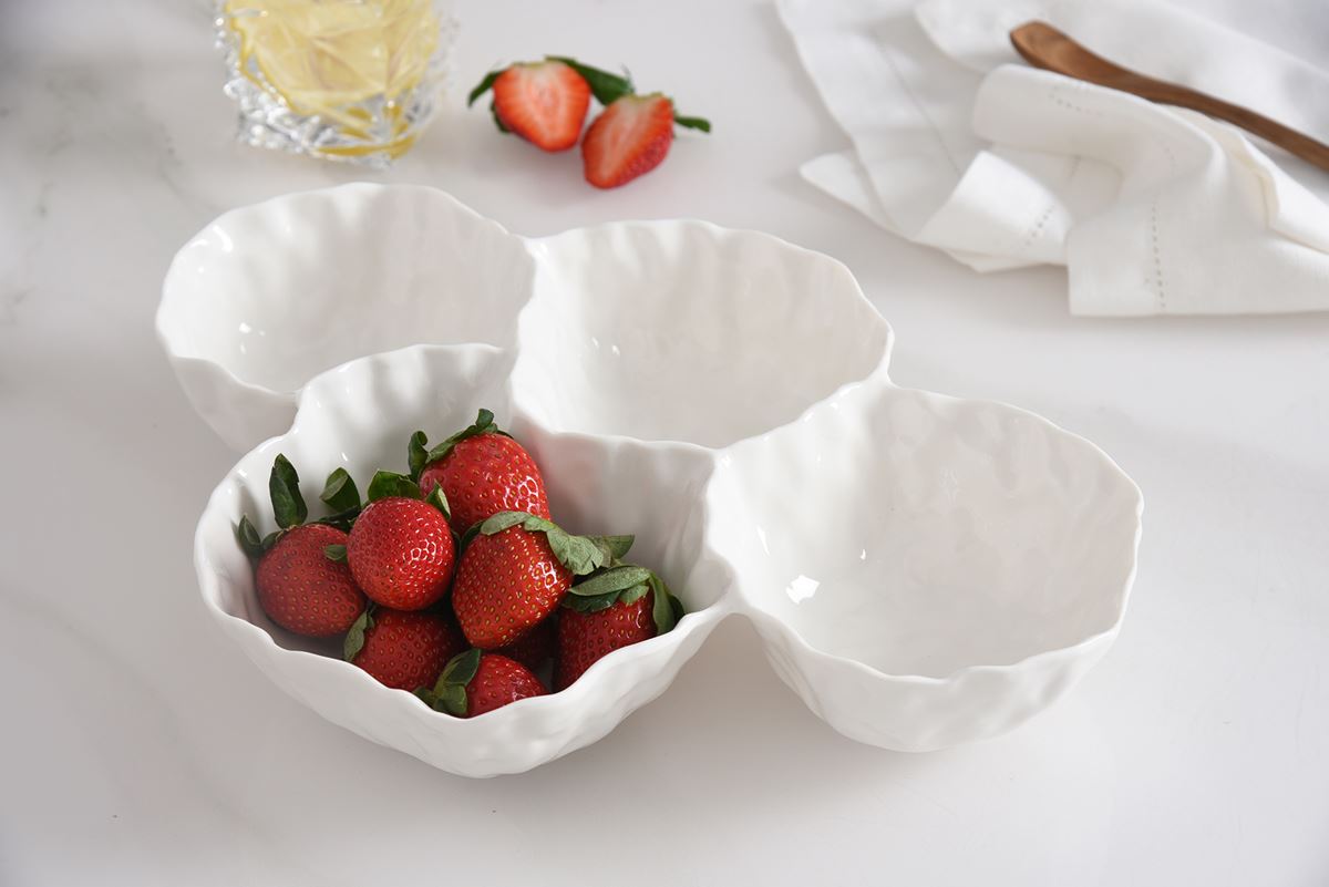 With its clean white finish and gently waved surface, the Willow 4 Section Server offers timeless beauty with a twist. Designed to complement any setting, it’s as versatile as it is refined: perfect for serving a variety of snacks, condiments, or appetizers. Crafted from high-fired porcelain, it’s food safe, tarnish-free, dishwasher safe, and oven friendly up to 500°F. Simplicity meets subtle texture in this modern all-white piece, making it a chic and practical addition to your serveware collection.