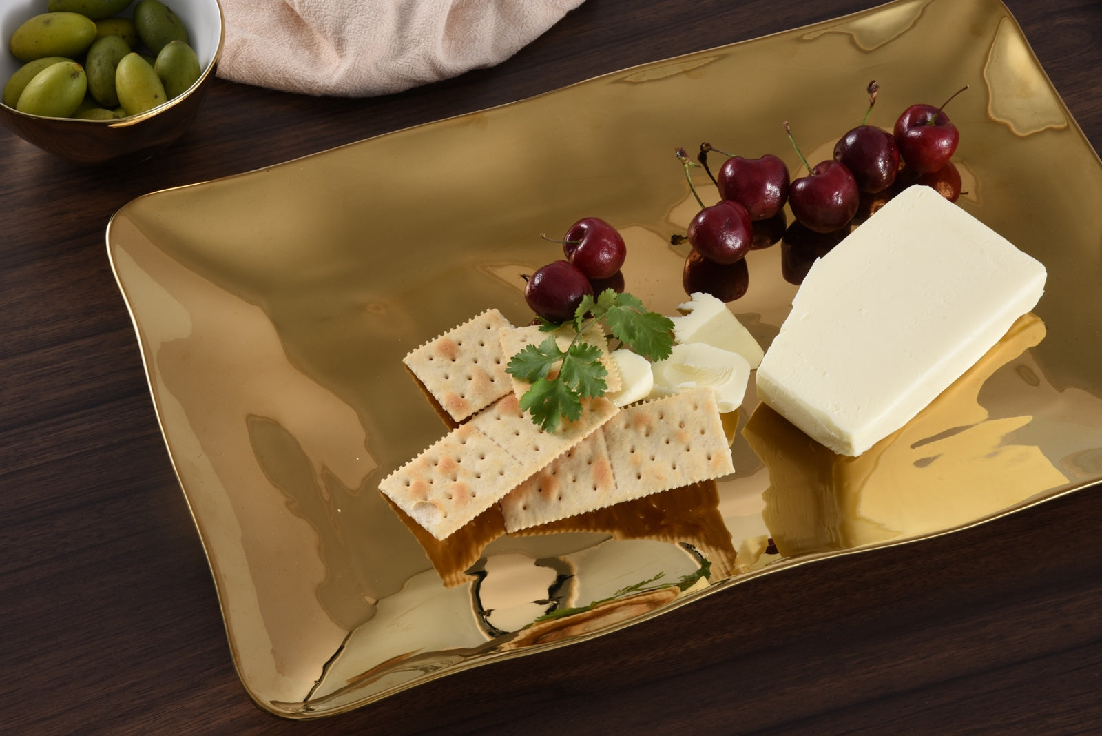 Pampa Bay Rectangular Platter from our Moonlight Collection. In casual and formal settings, this tray can be used to serve the main course, your favorite grilled vegetables or even dessert! A perfect platter for creating your next charcuterie board! Striking and elegant gold-tone titanium finished high-fired porcelain. Food safe, dishwasher safe, oven safe to 500°. Tarnish and stain-free. Easy Care.