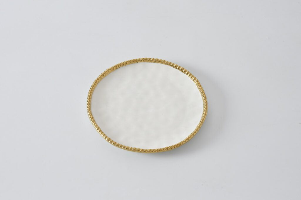 Set the Table with our round salad plate from our dinnerware collection. Each salad plate has a slim band of gold titanium beads against a gleaming white porcelain body adding understated elegance to any table. Adds a touch of style to fancy dinners or everyday meals. Perfect for serving salads, appetizers or desserts. Dishwasher safe, tarnish free, and stain resistant.