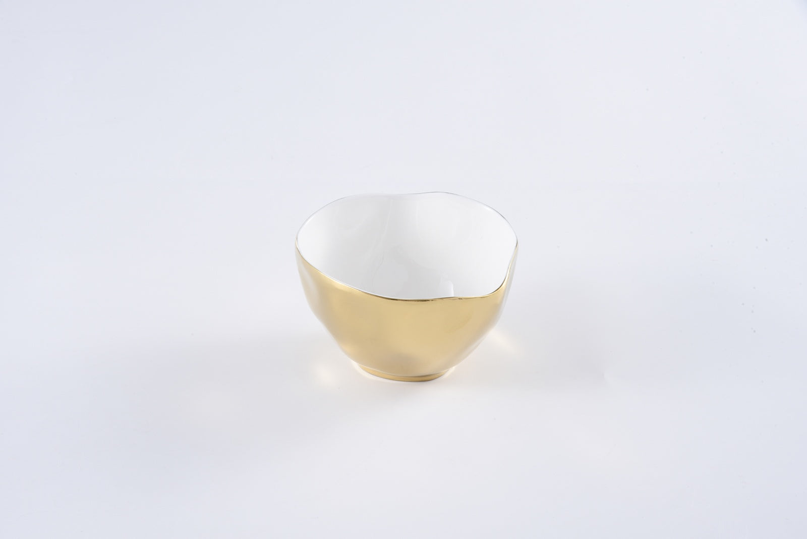 Pampa Bay Small Bowl from our Moonlight Collection. This bowls works on its own for condiments or snacks. It also looks great in combination with a larger version for dressing or dip! Crafted in a stunning white high-fired porcelain with gold titanium. Food safe, dishwasher safe, oven safe to 500°. Tarnish and stain-free. Easy Care.
