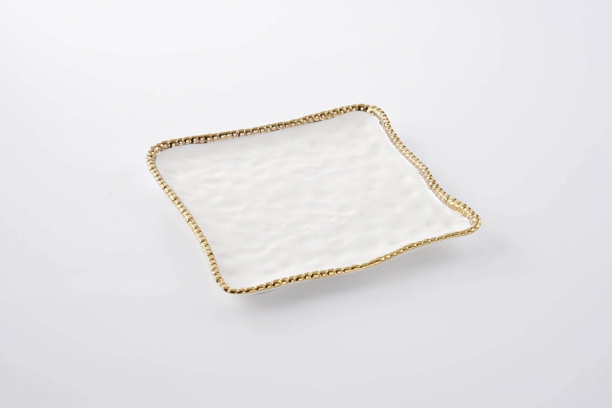 Pampa Bay Square serving platter Golden Salerno. Ideal for serving up your favorite appetizer or impressing dinner guests with a stunning dessert platter. You can even keep things warm in the oven right on the platter. Gleaming white porcelain with lustrous gold beads in titanium. Food safe. Dishwasher safe. Oven safe to 500°. Easy Care.