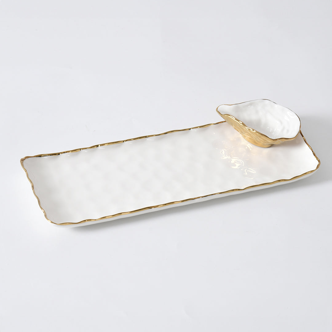 Enjoy homemade or takeout sushi in style with our Sushi Tray with Mini Oyster Bowl from our Portofino collection. Get creative and use for more than just sushi: perfect for cheese and crackers, veggies, dried fruits and nuts. Gorgeous white porcelain tray with a delicate gold trim. Bowl crafted in a stunning high-fired porcelain with gold finished exterior. Food safe, tarnish free, dishwasher safe, oven safe to 500°. Easy Care.