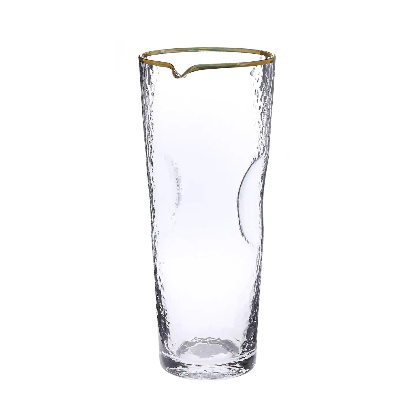 Pebbled glass is what differentiates this pitcher. It is bordered with a fine gold rim for accentuated elegance. It is wonderfully practical with two indents on both sides for your hands to fit inside while pouring. Fill it with the beverage of your choice, and, if it's a colored beverage, it will show through the lustrous glass.