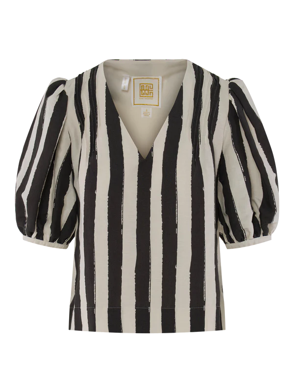 The Penny Top in Stripe Noir showcases voluminous puff sleeves and delicate pin tuck details that frame the V-neckline for a touch of structure and softness. The slightly tailored silhouette flatters while allowing easy movement, making it perfect for both everyday wear and dressier moments. The hand-painted stripe print adds striking contrast, blending simplicity with a contemporary edge that stands out without overpowering. Pair with the matching Saylor Short for a striking two piece set!