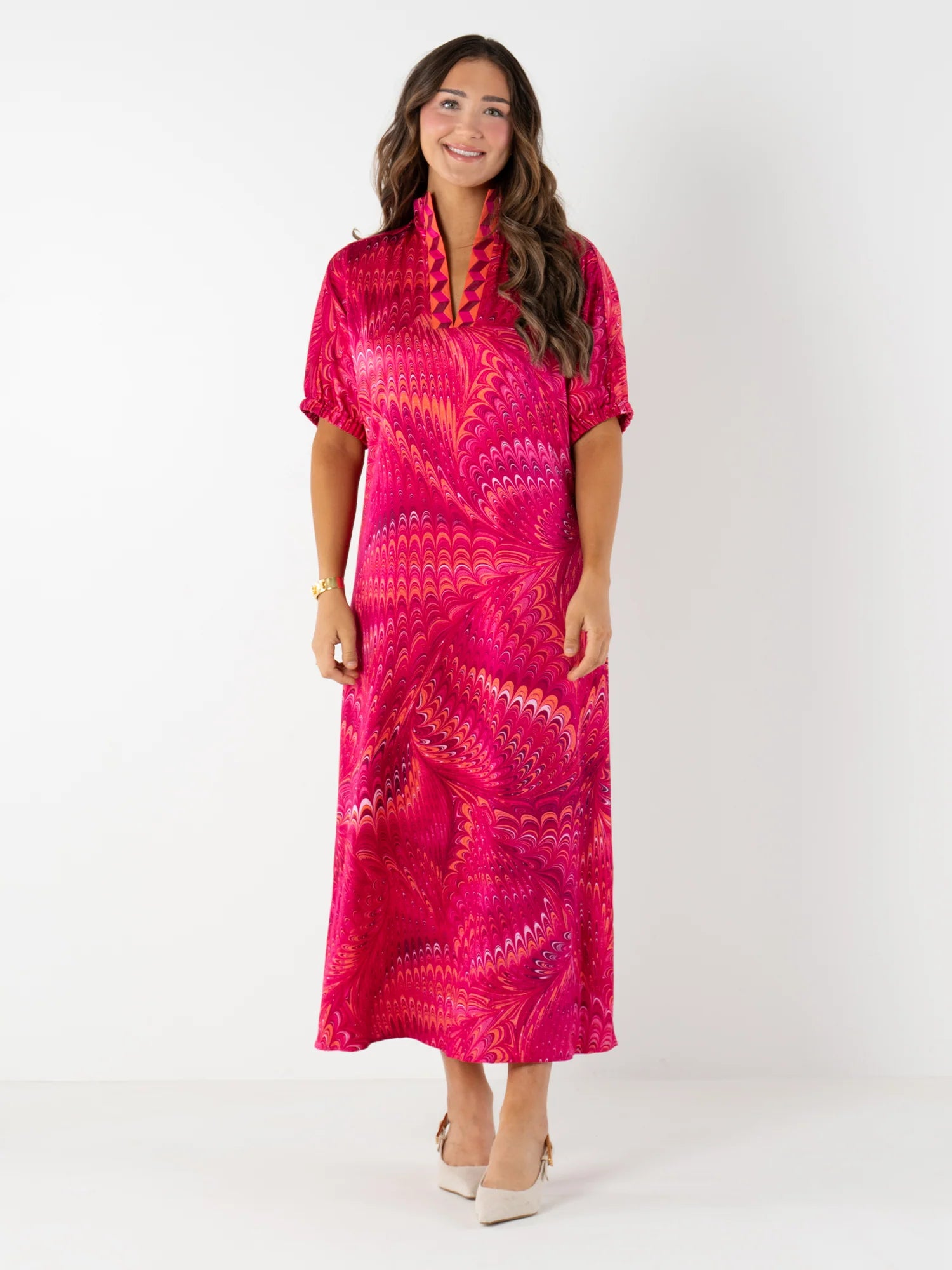 The Poppy Maxi in Venetian features a classic stand collar and loose elastic dolman sleeves for an effortlessly chic fit. Designed with side pockets and a flowing silhouette, this style is finished with a curved tail hem for graceful movement and a relaxed yet polished look. The Venetian print is a statement pattern bringing vibrant dimension and artistic flair to the timeless caftan silhouette.