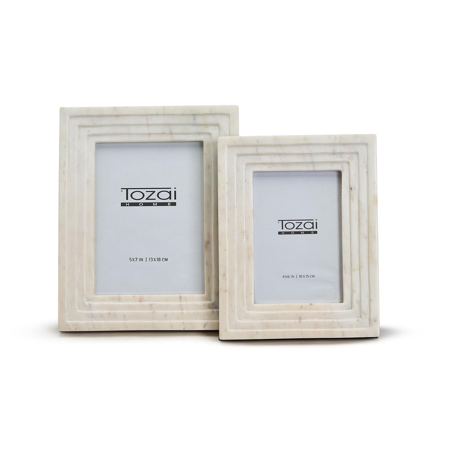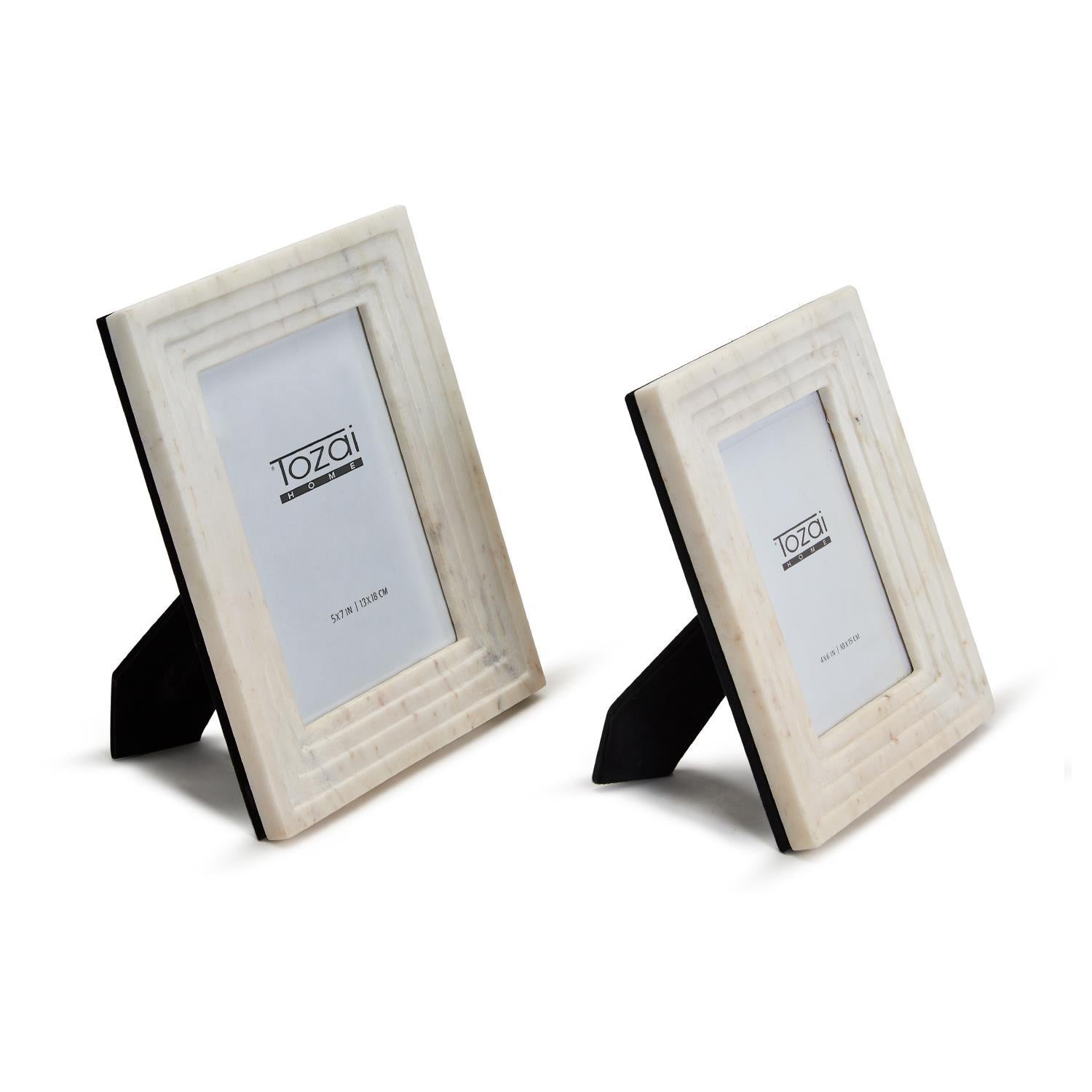 Bold, timeless and elegant this white-marble frame provides an elevated way to display your favorite photo in grand style. Each frame is beveled by hand adding a classic architectural element to the classic design. This frame makes a great gift idea or pair with more frames for a statement finish.
