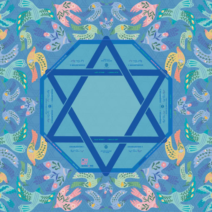 Celebrate tradition with the vibrant Shalom Mat, a harmonious blend of blues, yellows, greens, and pinks accented by delicate bird motifs and the Star of David. Designed to inspire joy and connection, this mat includes our classic instructional reminders along the edges to keep your game flowing. It comes rolled in a convenient canvas drawstring bag, ready for travel or storage.