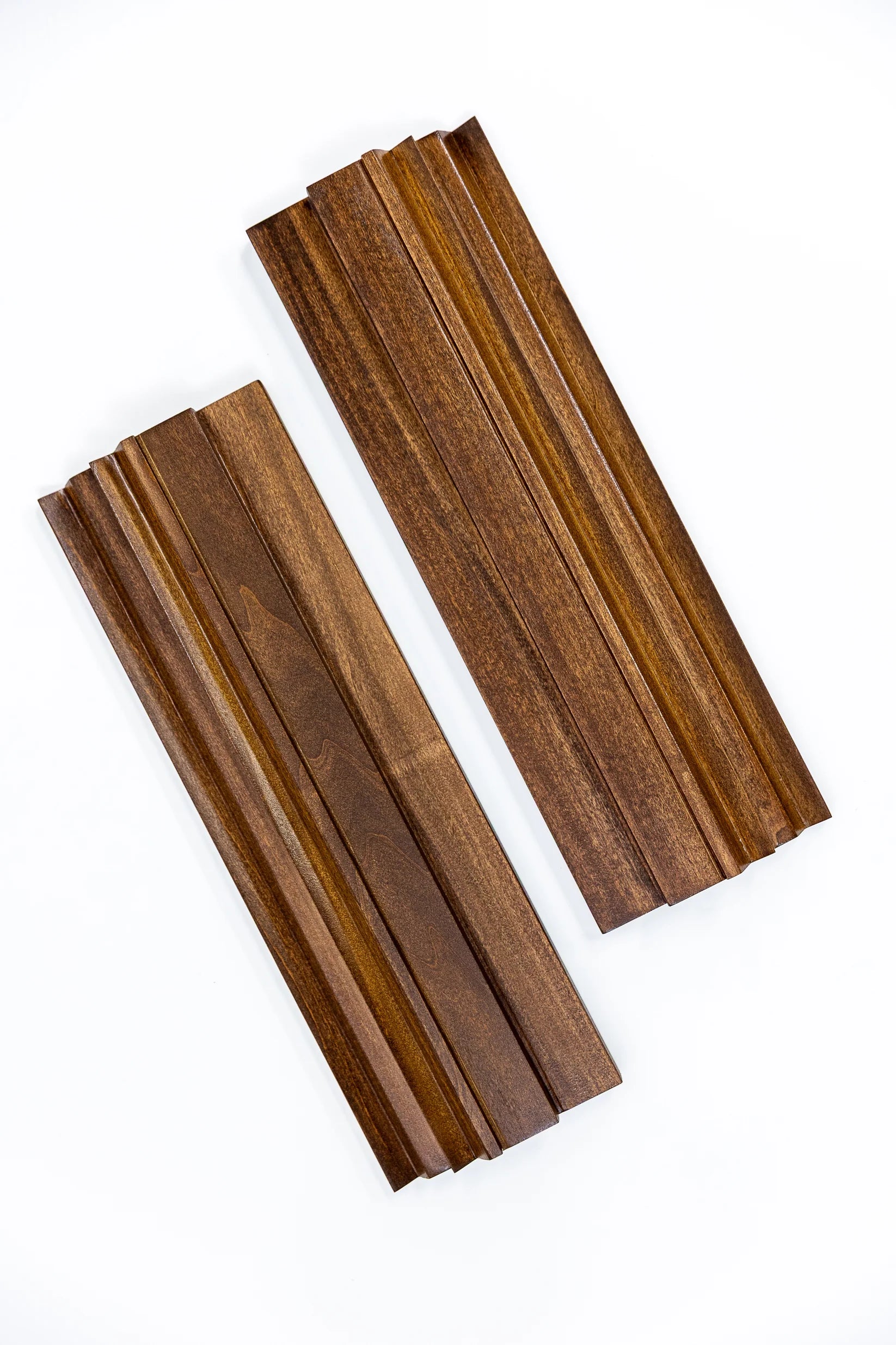 The racks are handmade in the USA of solid wood with either a walnut stain or a white paint and sealed with a clear coat. Each rack measures 17" long, 5.5" wide, and 1.5" tall. Each set include two double racks.